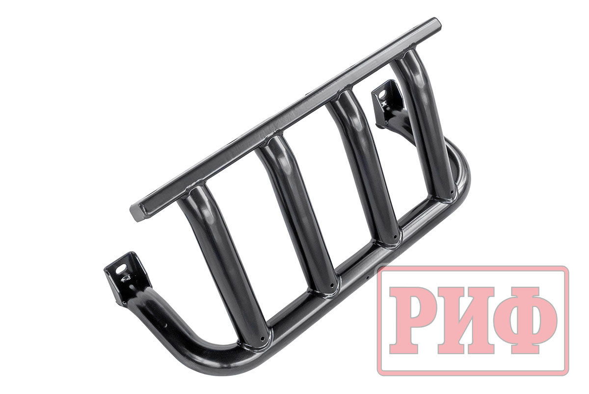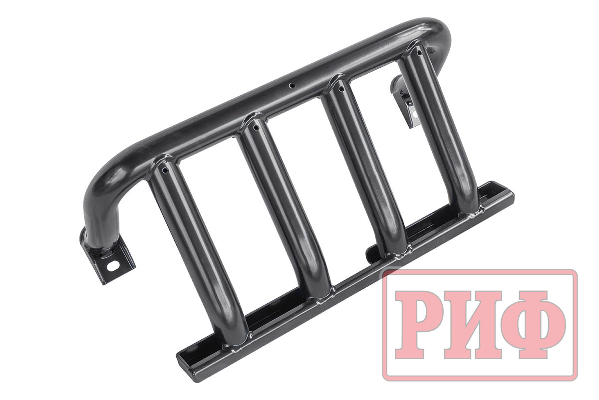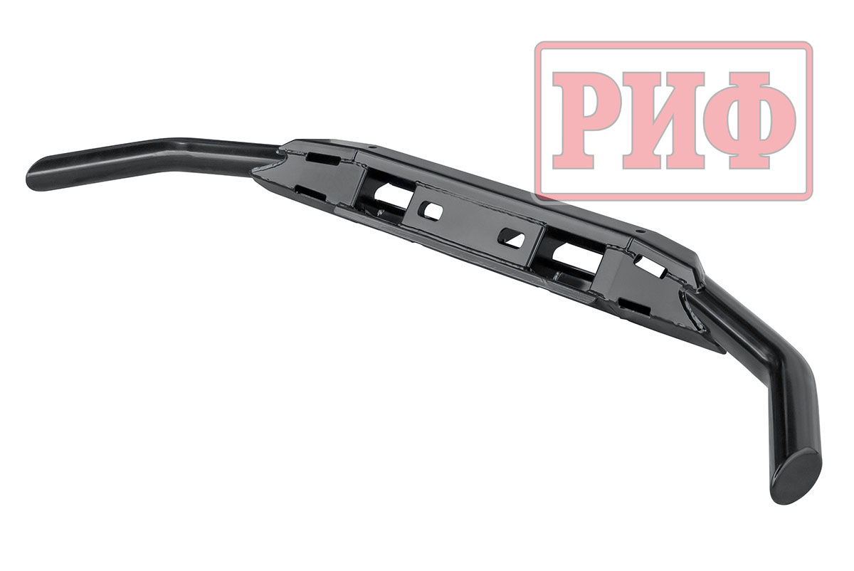 Мощные буксирные проушины крепятся к раме, одновременно выполняя роль установочных кронштейнов, поэтому при работе рывковым тросом или лебежении нагрузка будет передаваться не к бамперу, а сразу к раме автомобиля. Бампер очень красив и аккуратен, не сильно бросается в глаза на дороге. За бампер можно поднимать машину хай-джеком, для этого он оснащен усиленными упорами под реечный домкрат. Бампер можно установить с площадкой под лебедку РИФ в штатный бампер УАЗ Патриот (RIF060-30000). Для желающих использовать переносную лебедку, выпущен вариант бампера с квадратным разъемом под переноску.