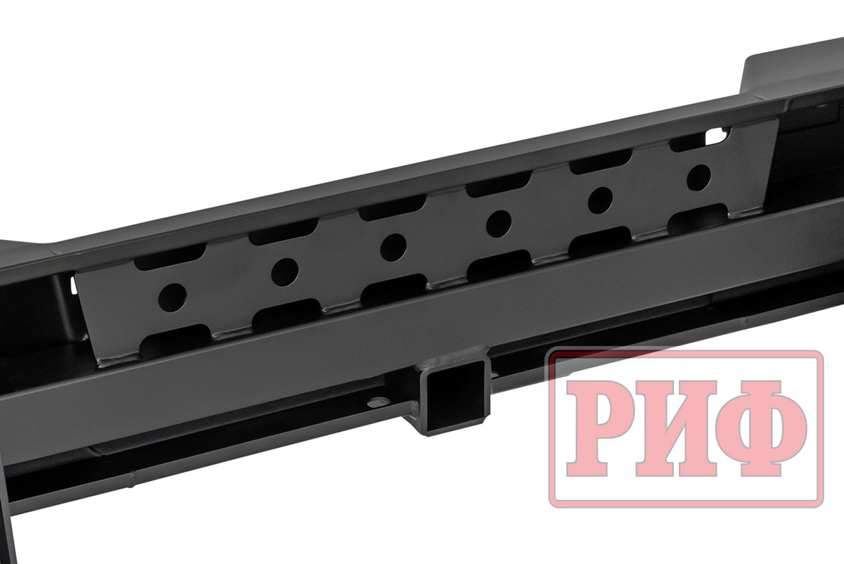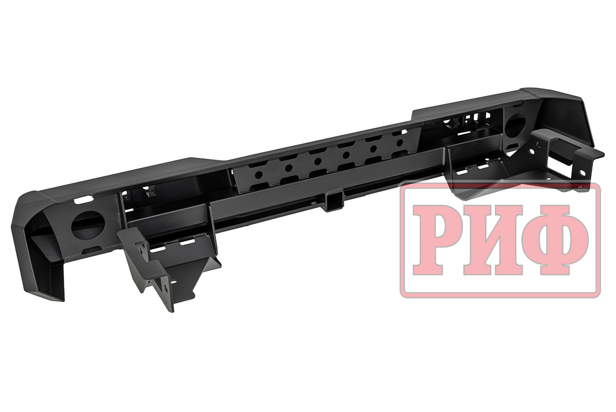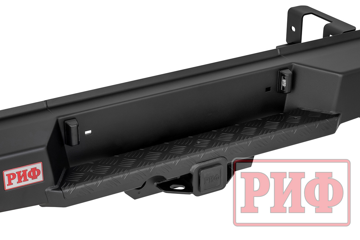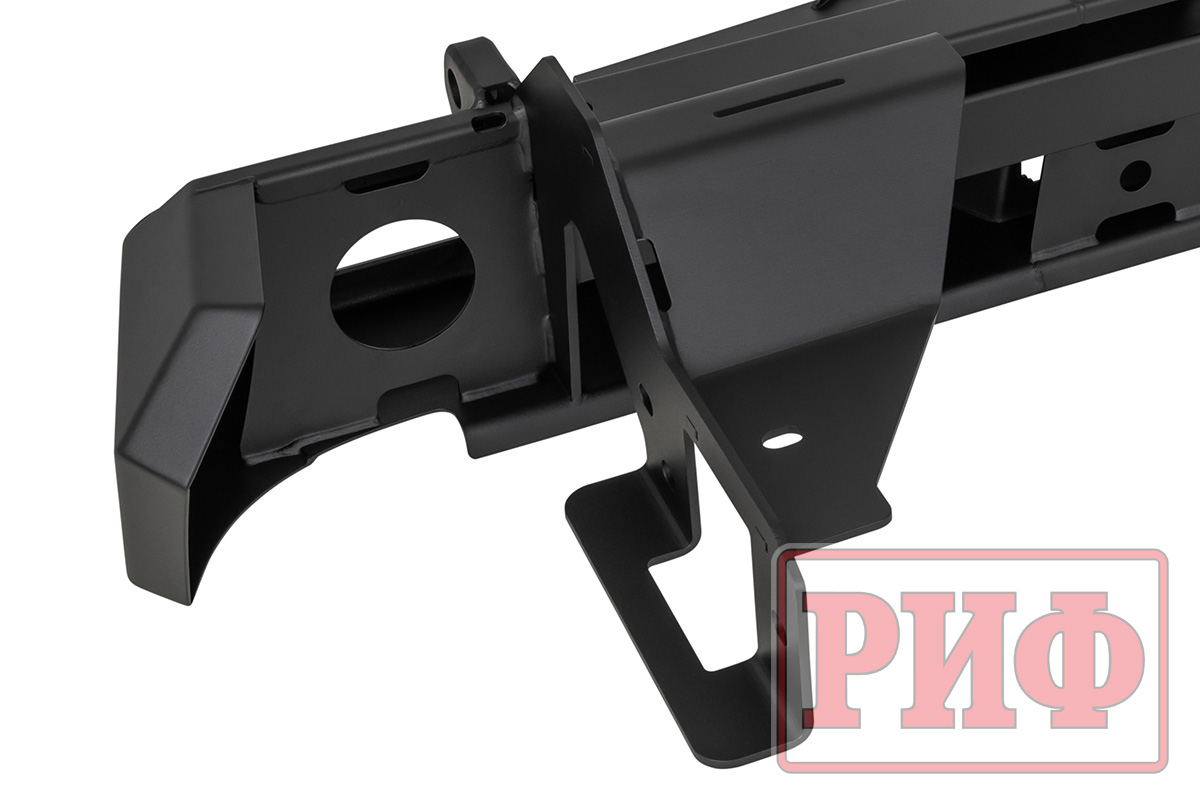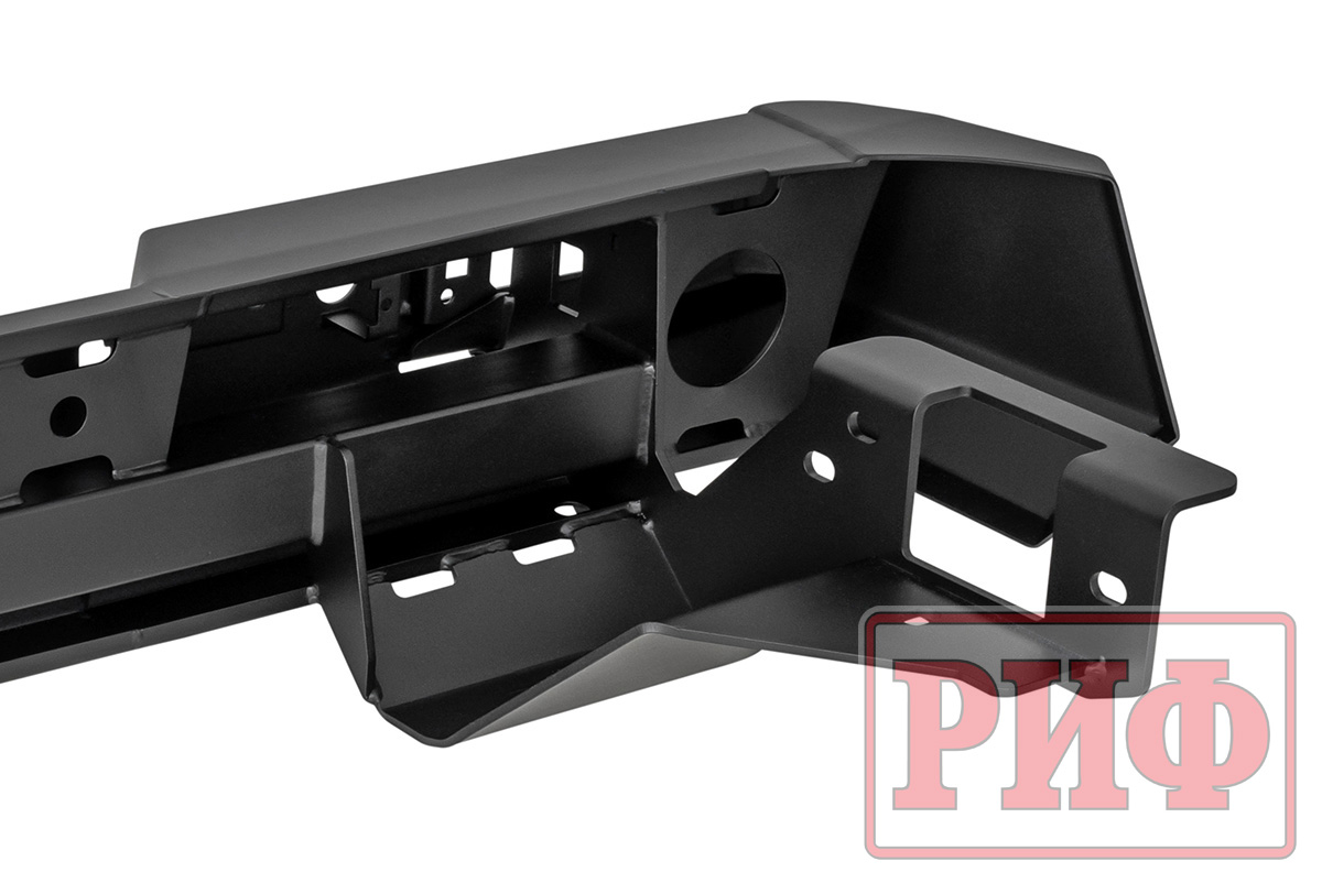 Задний силовой бампер РИФ надежно защитит кузов автомобиля на бездорожье или в городе в случае непредвиденных инцидентов. Бампер оборудован упорами под хай джек и буксирными проушинами для работы с рывковой или буксировочной стропой.
