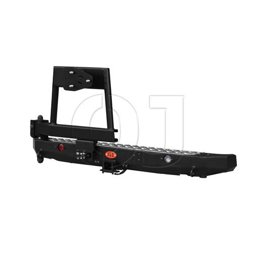 Задний силовой бампер для Lada 4х4. С облегчённой калиткой под запаску. Доп. фонари (заднего хода и стоп-сигнал), рамка номерного знака, дополнительный центральный кронштейн, квадрат 50х50, упоры под реечный домкрат, Al накладка, буксирные проушины. Калитка открывается влево немногим более чем на 90 градусов из соображений безопасности, «прикрывая» людей от дороги, в то же время не выступая на проезжую часть, при этом удобнее осуществлять погрузку-разгрузку со стороны обочины, а не со стороны проезжей части. Однако при желании можно приобрести этот бампер и правую калитку к нему.