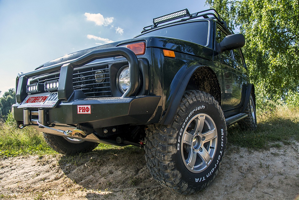 Бампер РИФ передний ВАЗ Нива с защитной дугой. Передний силовой бампер с защитной дугой служит для защиты автомобиля на бездорожье и в городе. В случае контакта или легкого столкновения с препятствием в виде камней, бревен, пней, колей или незадачливых водителей, риск получить серьезные повреждения машины существенно уменьшается, а это очень важно в экспедициях и в повседневной жизни. Бампер с кенгурятником не только защитит, но и украсит внедорожник благодаря эффектному и элегантному дизайну.