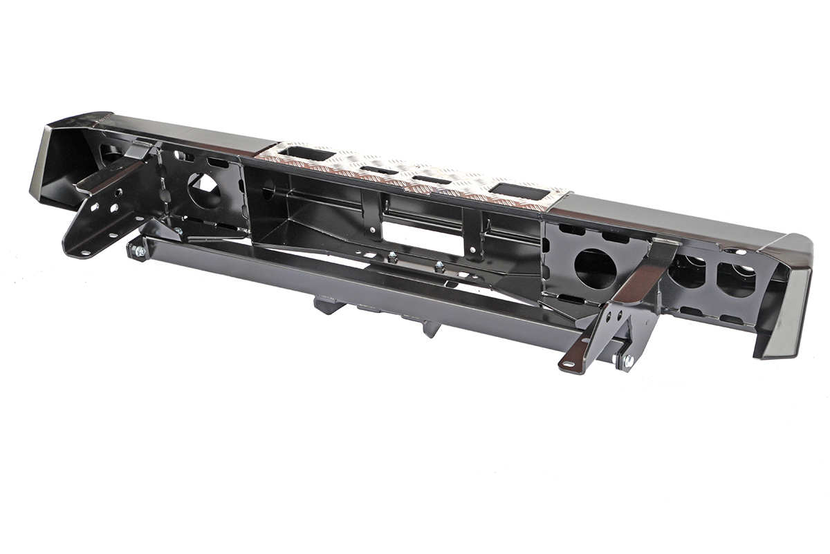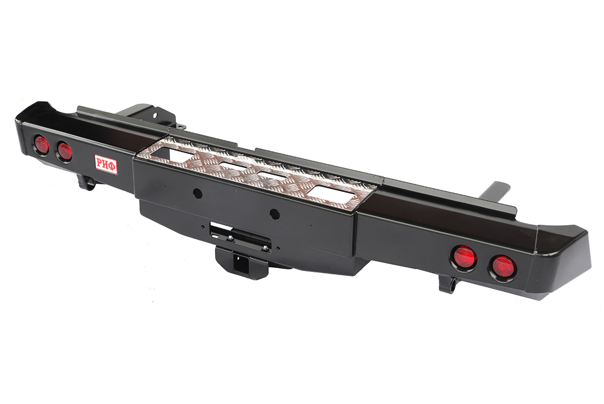 Задний силовой бампер РИФ надежно защитит кузов автомобиля на бездорожье или в городе в случае непредвиденных инцидентов. Бампер оборудован упорами под хай джек и буксирными проушинами для работы с рывковой или буксировочной стропой.