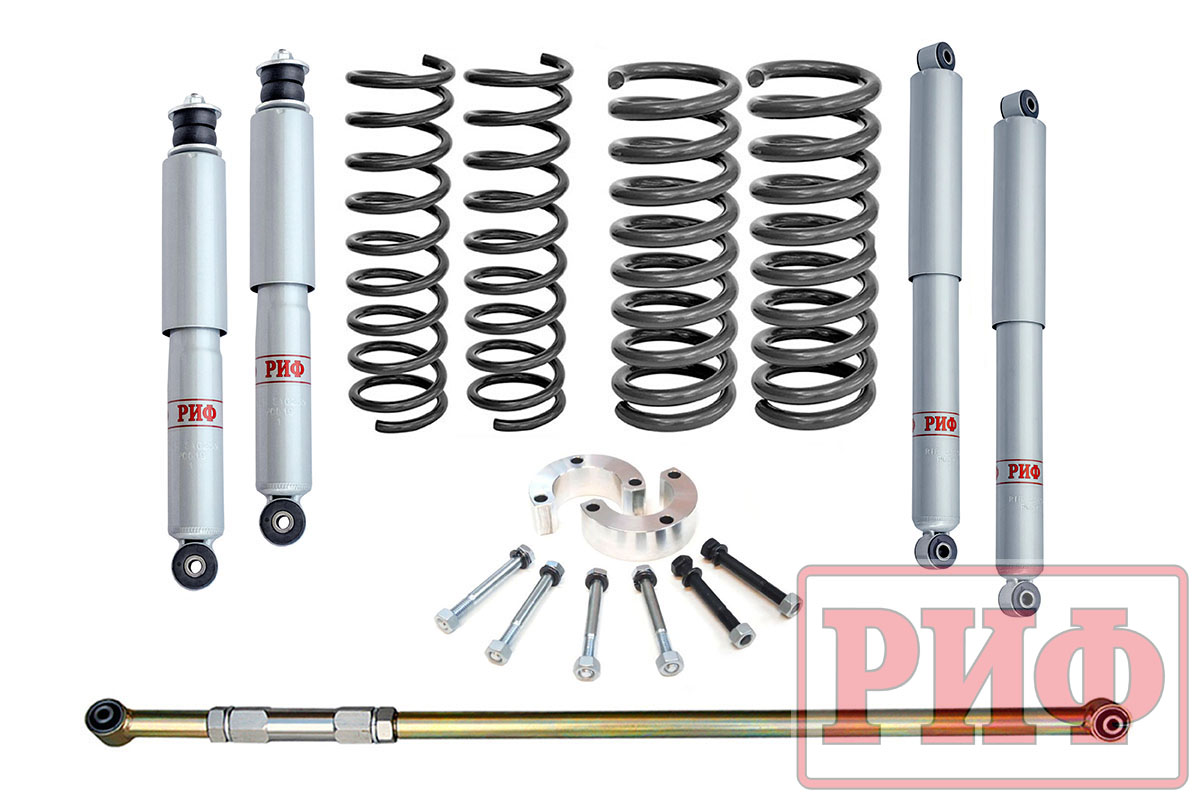 Все компоненты лифт-комплектов РИФ разработаны специально для эксплуатации внедорожника в тяжелых условиях на различных дорожных покрытиях. Амортизаторы с технологией R-Air и пружины РИФ не только компенсируют вес установленного на внедорожнике дополнительного оборудования (бамперов, порогов, дополнительных топливных баков, лебедок и прочего), но также существенно повышают грузоподъемность автомобиля.