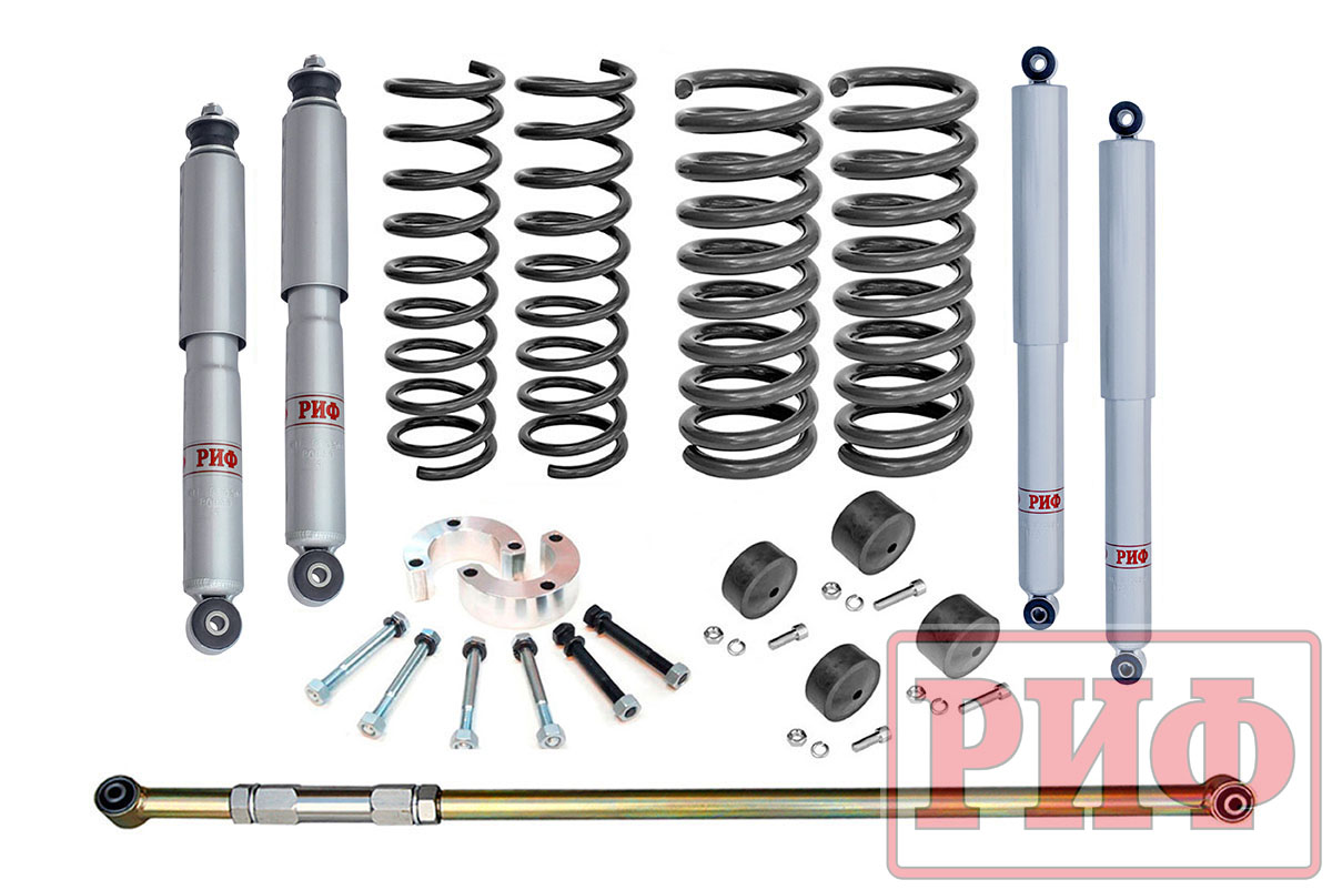 Все компоненты лифт-комплектов РИФ разработаны специально для эксплуатации внедорожника в тяжелых условиях на различных дорожных покрытиях. Амортизаторы с технологией R-Air и пружины РИФ не только компенсируют вес установленного на внедорожнике дополнительного оборудования (бамперов, порогов, дополнительных топливных баков, лебедок и прочего), но также существенно повышают грузоподъемность автомобиля.