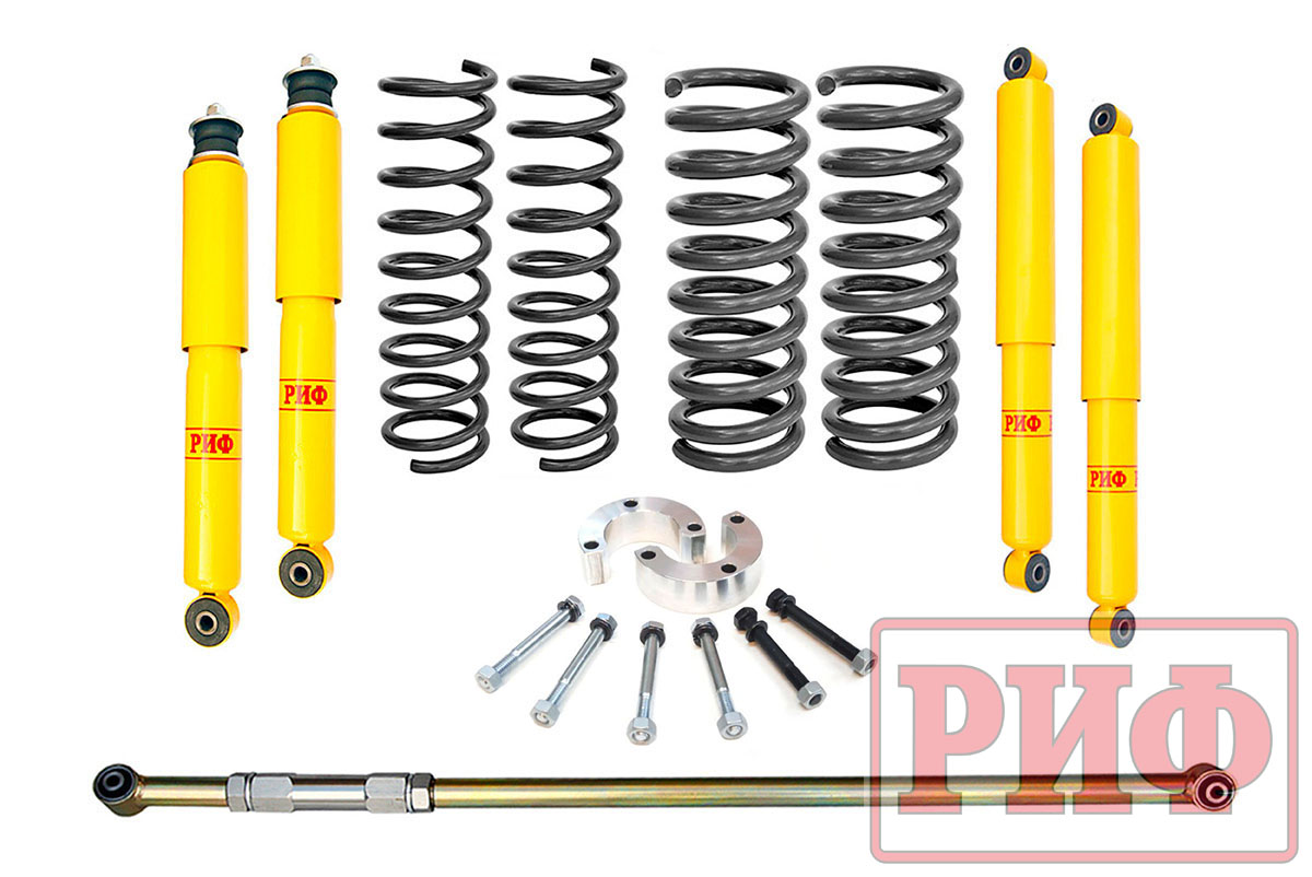 Все компоненты лифт-комплектов РИФ разработаны специально для эксплуатации внедорожника в тяжелых условиях на различных дорожных покрытиях. Амортизаторы с технологией R-Air и пружины РИФ не только компенсируют вес установленного на внедорожнике дополнительного оборудования (бамперов, порогов, дополнительных топливных баков, лебедок и прочего), но также существенно повышают грузоподъемность автомобиля.