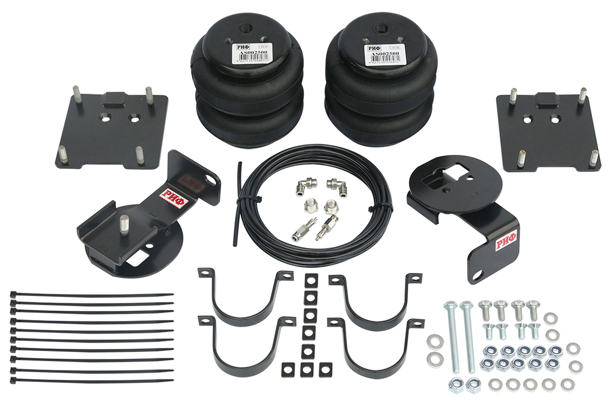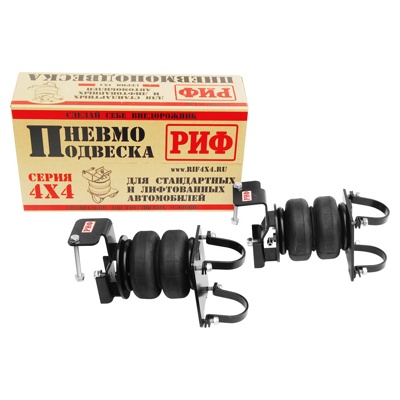 Пневмоподвеска РИФ для УАЗ Патриот/Пикап/Хантер, задний мост (для стандартной подвески) Комплект пневмоподвески РИФ устанавливается в дополнение к штатной подвеске автомобиля и позволяет снизить нагрузку на рессоры и использовать полную грузоподъёмность автомобиля без изменения геометрической проходимости. Установка пневмоподвески с рессорами меньшей грузоподъемности позволяет сохранить приемлемый комфорт и плавность хода в повседневной эксплуатации и при этом иметь возможность при необходимости перевезти значительное количество груза. Данный комплект пневмоподвески разработан специально для УАЗ Патриот/Пикап/Хантер. В комплект поставки включено: две пневмоподушки, кронштейны для крепления, необходимый крепеж и пневмофитинги, пневмомагистраль, клапаны управления давлением. Монтаж пневмоподвески РИФ не требует проведения сварочных работ и узко специализированных навыков и занимает около 1,5- 2 часов. Комплект рассчитан на установку со стандартной (не лифтованной задней подвеской).