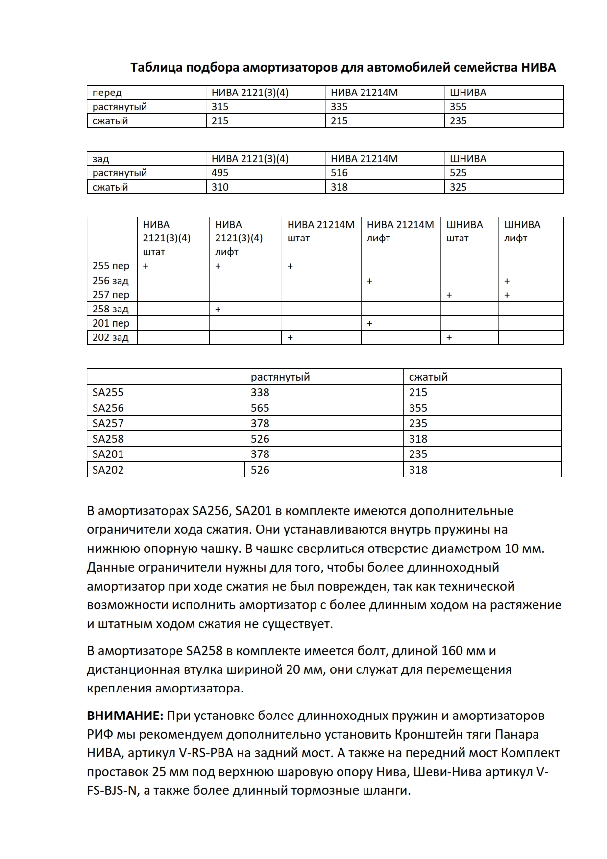 ВНИМАНИЕ: При установке более длинноходных пружин и амортизаторов РИФ мы рекомендуем дополнительно установить Кронштейн тяги Панара НИВА, артикул V-RS-PBA на задний мост. А также на передний мост Комплект проставок 25 мм под верхнюю шаровую опору Нива, Шеви-Нива артикул V-FS-BJS-N, а также более длинный тормозные шланги.