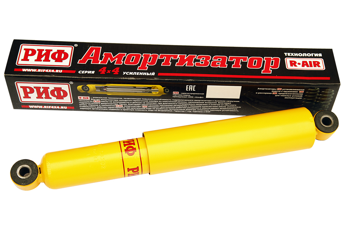 Усиленные амортизаторы РИФ изготовлены по уникальной технологии R-AIR, позволяющей повысить устойчивость гидравлического амортизатора к высоким нагрузкам. Внутри амортизатора находится герметичная камера из эластичной резины, заполненная воздухом. Благодаря технологии R-AIR масло не вспенивается и дольше не закипает при длительных непрерывных нагрузках в отличие от обычного гидравлического амортизатора или амортизатора с технологией Foam Cell, которую мы использовали ранее, где вспениванию препятствует просто прослойка из пористой резины.