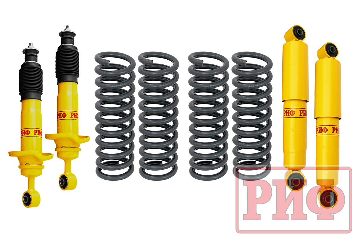 Все компоненты лифт-комплектов РИФ разработаны специально для эксплуатации внедорожника в тяжелых условиях на различных дорожных покрытиях. Амортизаторы с технологией R-Air и пружины РИФ не только компенсируют вес установленного на внедорожнике дополнительного оборудования (бамперов, порогов, дополнительных топливных баков, лебедок и прочего), но также существенно повышают грузоподъемность автомобиля.