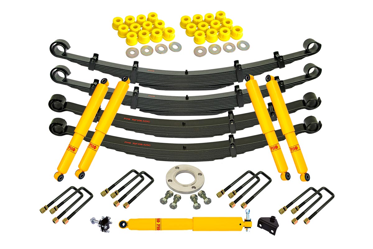 Все компоненты лифт-комплектов РИФ разработаны специально для эксплуатации внедорожника в тяжелых условиях на различных дорожных покрытиях. Рессоры, амортизаторы с технологией Foam Cell и пружины РИФ не только компенсируют вес установленного на внедорожнике дополнительного оборудования (бамперов, порогов, дополнительных топливных баков, лебедок и прочего), но также существенно повышают грузоподъемность автомобиля. Удлиненные стремянки и серьги РИФ произведены из высококачественных материалов и имеют увеличенный запас прочности.