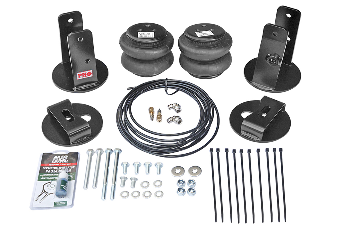 Комплект пневмоподвески РИФ устанавливается в дополнение к лифтованной подвеске автомобиля и позволяет снизить нагрузку на рессоры и использовать полную грузоподъёмность автомобиля без изменения геометрической проходимости.