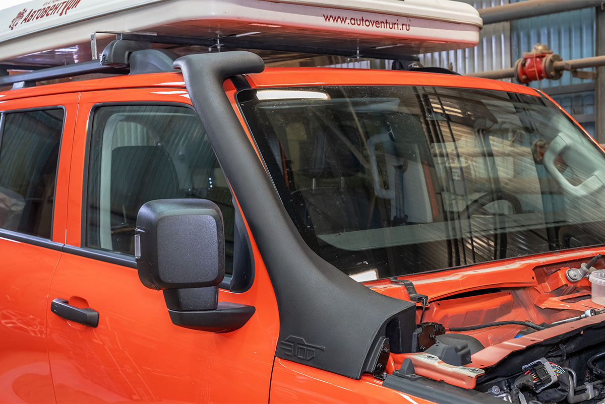 Шноркель – наружный воздухозаборник двигателя для преодоления водных преград. Наличие шноркеля почти полностью исключает такую серьёзную поломку двигателя как гидроудар, предотвращает попадание воды в систему смазки двигателя.